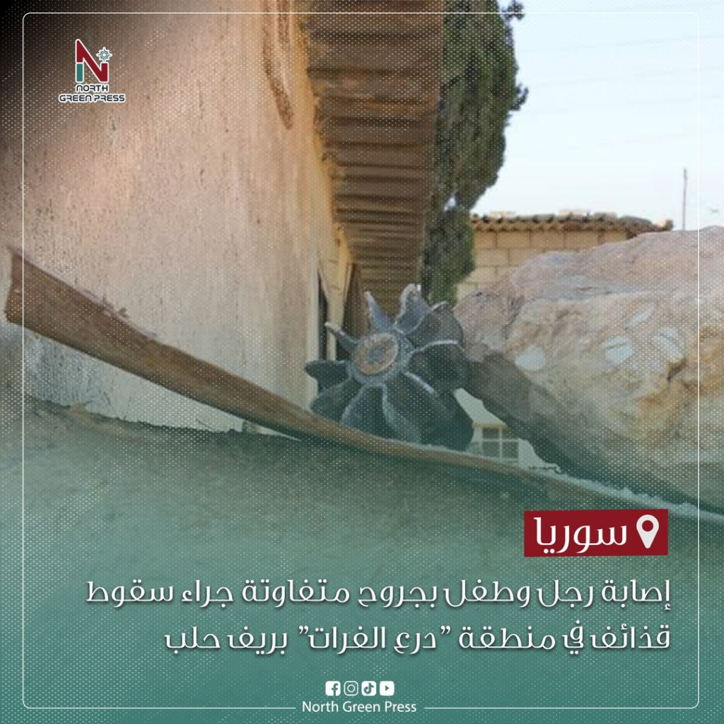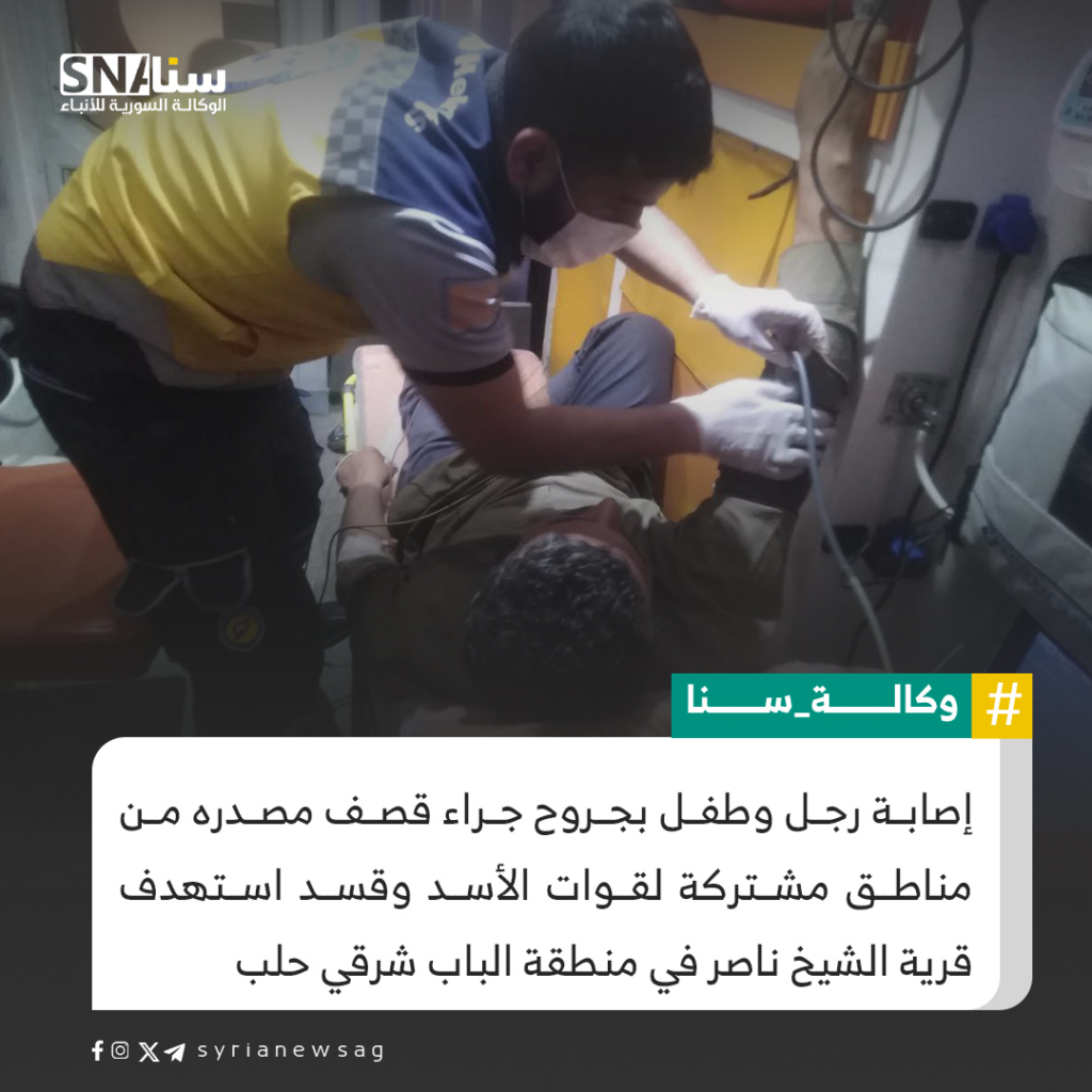 In the evening of Thursday, May 9th, 2024, a man and child were moderately injured as a result of the alleged bombing which originated from the areas jointly controlled by the Syrian Democratic Forces and Syrian regime forces. The casualties took place in the village of Sheikh Nasser in the al-Bab area in the countryside to the east of Aleppo, Syria.