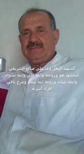 Hassan Ehsan Al Sabaha reported on Facebook that his cousin Ali Bilal al-Sabha al-Sharifi died in front of his house after airstrikes on the neighbourhood (see photo below). This was also reported by Ehab Alshuraife, who said that Ali Bilal was his only uncle.