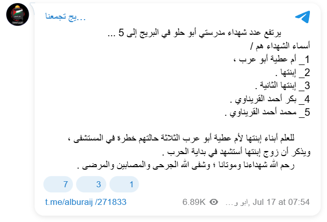 🤝👈 The number of martyrs from Abu Helou School in Al-Bureij rises to 5... The names of the martyrs are: 1_ Umm Atiya Abu Arab, 2_ Her daughter. 3_ Her second daughter. 4_ Bakr Ahmed Al-Qarinawi. 5_ Muhammad Ahmed Al-Qarinawi. 👈 For your information, the three sons of her daughter from Umm Atiya Abu Arab are in critical condition in the hospital. It is noteworthy that her daughter's husband was martyred at the beginning of the war. 🤲 May God have mercy on our martyrs and our dead; and may God heal the wounded, injured and sick. 🤝👈 The number of martyrs from Abu Helou School in Al-Bureij rises to 5... The names of the martyrs are: 1_ Umm Atiya Abu Arab, 2_ Her daughter. 3_ Her second daughter. 4_ Bakr Ahmed Al-Qarinawi. 5_ Muhammad Ahmed Al-Qarinawi. 👈 For your information, the three sons of her daughter from Umm Atiya Abu Arab are in critical condition in the hospital. It is noteworthy that her daughter's husband was martyred at the beginning of the war. 🤲 May God have mercy on our martyrs and our dead; and may God heal the wounded, injured and sick.