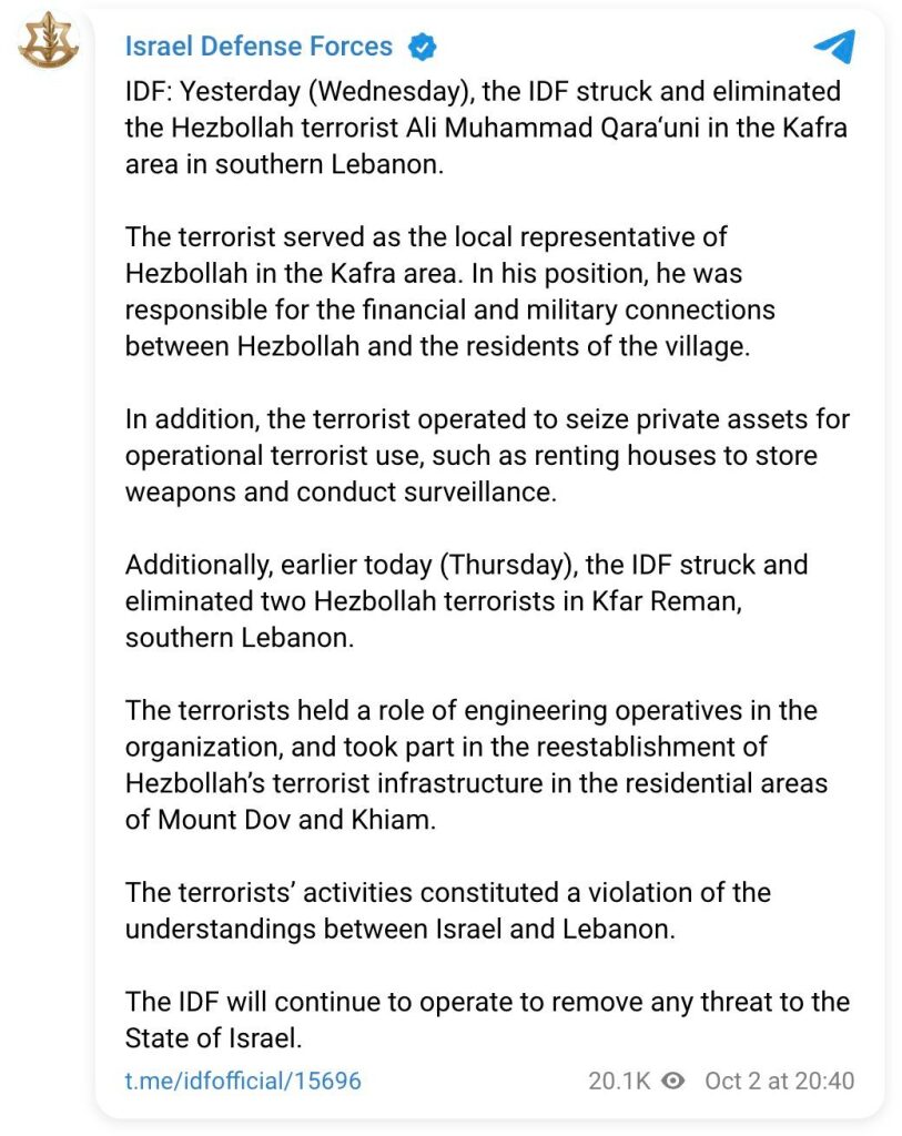IDF: Yesterday (Wednesday), the IDF struck and eliminated the Hezbollah terrorist Ali Muhammad Qara‘uni in the Kafra area in southern Lebanon. The terrorist served as the local representative of Hezbollah in the Kafra area. In his position, he was responsible for the financial and military connections between Hezbollah and the residents of the village. In addition, the terrorist operated to seize private assets for operational terrorist use, such as renting houses to store weapons and conduct surveillance. Additionally, earlier today (Thursday), the IDF struck and eliminated two Hezbollah terrorists in Kfar Reman, southern Lebanon. The terrorists held a role of engineering operatives in the organization, and took part in the reestablishment of Hezbollah’s terrorist infrastructure in the residential areas of Mount Dov and Khiam. The terrorists’ activities constituted a violation of the understandings between Israel and Lebanon. The IDF will continue to operate to remove any threat to the State of Israel. IDF: Yesterday (Wednesday), the IDF struck and eliminated the Hezbollah terrorist Ali Muhammad Qara‘uni in the Kafra area in southern Lebanon. The terrorist served as the local representative of Hezbollah in the Kafra area. In his position, he was responsible for the financial and military connections between Hezbollah and the residents of the village. In addition, the terrorist operated to seize private assets for operational terrorist use, such as renting houses to store weapons and conduct surveillance. Additionally, earlier today (Thursday), the IDF struck and eliminated two Hezbollah terrorists in Kfar Reman, southern Lebanon. The terrorists held a role of engineering operatives in the organization, and took part in the reestablishment of Hezbollah’s terrorist infrastructure in the residential areas of Mount Dov and Khiam. The terrorists’ activities constituted a violation of the understandings between Israel and Lebanon. The IDF will continue to operate to remove any threat to the State of Israel.