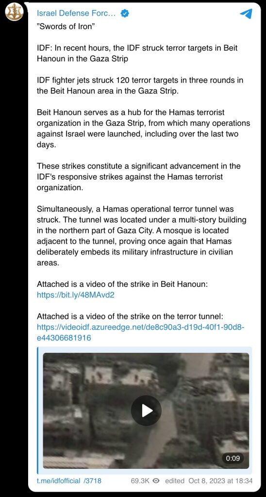 ”Swords of Iron”IDF: In recent hours, the IDF struck terror targets in Beit Hanoun in the Gaza StripIDF fighter jets struck 120 terror targets in three rounds in the Beit Hanoun area in the Gaza Strip.Beit Hanoun serves as a hub for the Hamas terrorist organization in the Gaza Strip, from which many operations against Israel were launched, including over the last two days.These strikes constitute a significant advancement in the IDF's responsive strikes against the Hamas terrorist organization.Simultaneously, a Hamas operational terror tunnel was struck. The tunnel was located under a multi-story building in the northern part of Gaza City. A mosque is located adjacent to the tunnel, proving once again that Hamas deliberately embeds its military infrastructure in civilian areas.Attached is a video of the strike in Beit Hanoun: https://bit.ly/48MAvd2Attached is a video of the strike on the terror tunnel: https://videoidf.azureedge.net/de8c90a3-d19d-40f1-90d8-e44306681916 ”Swords of Iron”IDF: In recent hours, the IDF struck terror targets in Beit Hanoun in the Gaza StripIDF fighter jets struck 120 terror targets in three rounds in the Beit Hanoun area in the Gaza Strip.Beit Hanoun serves as a hub for the Hamas terrorist organization in the Gaza Strip, from which many operations against Israel were launched, including over the last two days.These strikes constitute a significant advancement in the IDF's responsive strikes against the Hamas terrorist organization.Simultaneously, a Hamas operational terror tunnel was struck. The tunnel was located under a multi-story building in the northern part of Gaza City. A mosque is located adjacent to the tunnel, proving once again that Hamas deliberately embeds its military infrastructure in civilian areas.Attached is a video of the strike in Beit Hanoun: https://bit.ly/48MAvd2Attached is a video of the strike on the terror tunnel: https://videoidf.azureedge.net/de8c90a3-d19d-40f1-90d8-e44306681916