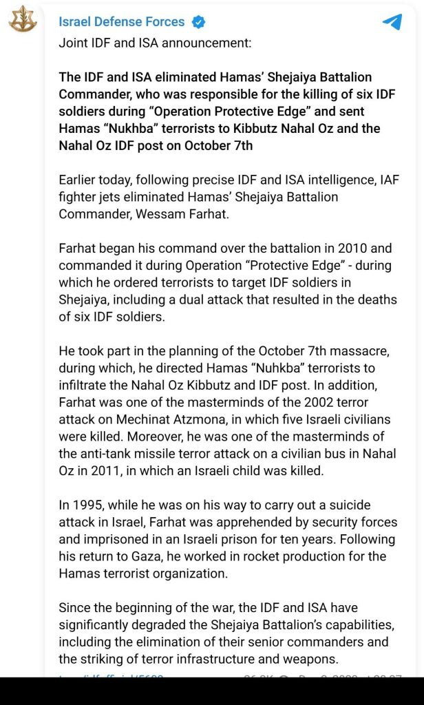 Joint IDF and ISA announcement: The IDF and ISA eliminated Hamas’ Shejaiya Battalion Commander, who was responsible for the killing of six IDF soldiers during “Operation Protective Edge” and sent Hamas “Nukhba” terrorists to Kibbutz Nahal Oz and the Nahal Oz IDF post on October 7thEarlier today, following precise IDF and ISA intelligence, IAF fighter jets eliminated Hamas’ Shejaiya Battalion Commander, Wessam Farhat.Farhat began his command over the battalion in 2010 and commanded it during Operation “Protective Edge” - during which he ordered terrorists to target IDF soldiers in Shejaiya, including a dual attack that resulted in the deaths of six IDF soldiers.He took part in the planning of the October 7th massacre, during which, he directed Hamas “Nuhkba” terrorists to infiltrate the Nahal Oz Kibbutz and IDF post. In addition, Farhat was one of the masterminds of the 2002 terror attack on Mechinat Atzmona, in which five Israeli civilians were killed. Moreover, he was one of the masterminds of the anti-tank missile terror attack on a civilian bus in Nahal Oz in 2011, in which an Israeli child was killed. In 1995, while he was on his way to carry out a suicide attack in Israel, Farhat was apprehended by security forces and imprisoned in an Israeli prison for ten years. Following his return to Gaza, he worked in rocket production for the Hamas terrorist organization.Since the beginning of the war, the IDF and ISA have significantly degraded the Shejaiya Battalion’s capabilities, including the elimination of their senior commanders and the striking of terror infrastructure and weapons. Joint IDF and ISA announcement: The IDF and ISA eliminated Hamas’ Shejaiya Battalion Commander, who was responsible for the killing of six IDF soldiers during “Operation Protective Edge” and sent Hamas “Nukhba” terrorists to Kibbutz Nahal Oz and the Nahal Oz IDF post on October 7thEarlier today, following precise IDF and ISA intelligence, IAF fighter jets eliminated Hamas’ Shejaiya Battalion Commander, Wessam Farhat.Farhat began his command over the battalion in 2010 and commanded it during Operation “Protective Edge” - during which he ordered terrorists to target IDF soldiers in Shejaiya, including a dual attack that resulted in the deaths of six IDF soldiers.He took part in the planning of the October 7th massacre, during which, he directed Hamas “Nuhkba” terrorists to infiltrate the Nahal Oz Kibbutz and IDF post. In addition, Farhat was one of the masterminds of the 2002 terror attack on Mechinat Atzmona, in which five Israeli civilians were killed. Moreover, he was one of the masterminds of the anti-tank missile terror attack on a civilian bus in Nahal Oz in 2011, in which an Israeli child was killed. In 1995, while he was on his way to carry out a suicide attack in Israel, Farhat was apprehended by security forces and imprisoned in an Israeli prison for ten years. Following his return to Gaza, he worked in rocket production for the Hamas terrorist organization.Since the beginning of the war, the IDF and ISA have significantly degraded the Shejaiya Battalion’s capabilities, including the elimination of their senior commanders and the striking of terror infrastructure and weapons.