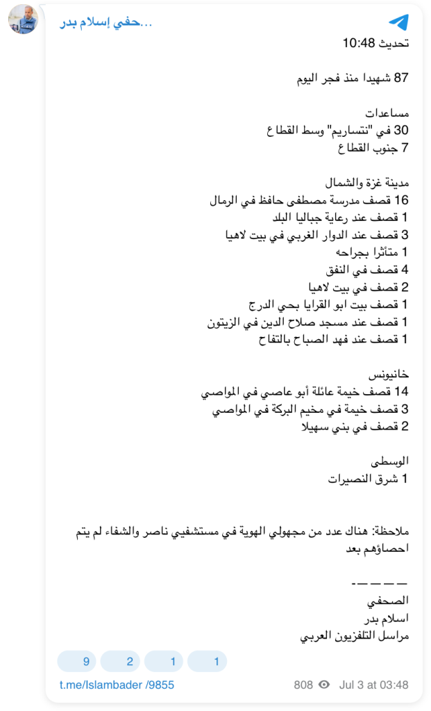 Update 10:48 87 martyrs since dawn today Aid 30 in "Netzarim" central Gaza Strip 7 southern Gaza Strip Gaza City and the north 16 bombing of Mustafa Hafez School in Al-Rimal 1 bombing at the Jabalia Al-Balad Care Center 3 bombing at the western roundabout in Beit Lahia 1 succumbed to his wounds 4 bombing in the tunnel 2 bombing in Beit Lahia 1 bombing of Abu Al-Qaraya's house in Al-Daraj neighborhood 1 bombing at Salah Al-Din Mosque in Al-Zeitoun 1 bombing at Fahd Al-Sabah in Al-Tuffah Khan Yunis 14 bombing of the Abu Asi family's tent in Al-Mawasi 3 bombing of a tent in Al-Barakah camp in Al-Mawasi 2 bombing in Bani Suhaila Al-Wusta 1 east of Al-Nuseirat Note: There are a number of unidentified people in Nasser and Al-Shifa hospitals who have not yet been counted ————- Journalist Salam Badr, Al-Arabiya TV correspondent Update 10:48 87 martyrs since dawn today Aid 30 in "Netzarim" central Gaza Strip 7 southern Gaza Strip Gaza City and the north 16 bombing of Mustafa Hafez School in Al-Rimal 1 bombing at the Jabalia Care Center Country 3 Shelling at the western roundabout in Beit Lahia 1 succumbed to his wounds 4 Shelling in the tunnel 2 Shelling in Beit Lahia 1 Shelling of Abu Al-Qaraya’s house in Al-Daraj neighborhood 1 Shelling at Salah Al-Din Mosque in Al-Zeitoun 1 Shelling at Fahd Al-Sabah in Al-Tuffah Khan Yunis 14 Shelling of the Abu Asi family’s tent in Al-Mawasi 3 Shelling of a tent in Al-Barakah camp in Al-Mawasi 2 Shelling in Bani Suhaila Al-Wusta 1 East of Al-Nuseirat Note: There are a number of unidentified people in Nasser and Al-Shifa hospitals who have not yet been counted ————- Journalist Salam Badr, Al-Arabiya TV correspondent