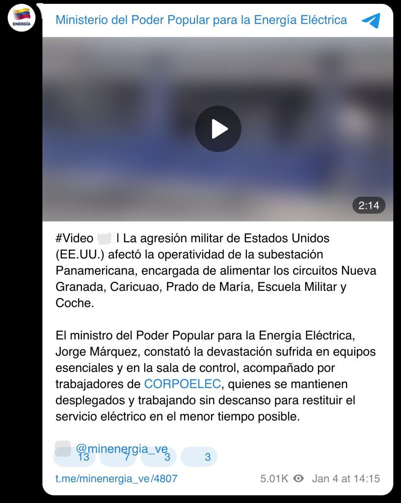 #Video 馃摴 | The United States military aggression affected the operation of the Panamericana substation, which supplies power to the Nueva Granada, Caricuao, Prado de Mar铆a, Escuela Militar, and Coche circuits. The Minister of People's Power for Electrical Energy, Jorge M谩rquez, confirmed the devastation suffered by essential equipment and the control room, accompanied by CORPOELEC workers, who remain deployed and working tirelessly to restore electrical service as quickly as possible. 馃摫 @minenergia_ve #Video 馃摴 | The United States military aggression affected the operation of the Panamericana substation, which supplies power to the Nueva Granada, Caricuao, Prado de Mar铆a, Escuela Militar, and Coche circuits. The Minister of People's Power for Electrical Energy, Jorge M谩rquez, inspected the devastation suffered by essential equipment and the control room, accompanied by CORPOELEC workers, who remain deployed and working tirelessly to restore electrical service as quickly as possible. 馃摫 @minenergia_ve