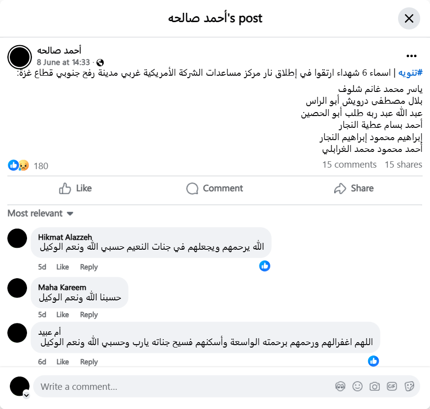 #Notice | The names of the 6 martyrs who were killed in the shooting at the American company's aid center west of Rafah, south of the Gaza Strip: Yasser Muhammad Ghanem Shalouf, Bilal Mustafa Darwish Abu al-Ras, Abdullah Abd Rabbuh Talab Abu al-Hussain, Ahmed Bassam Attia al-Najjar, Ibrahim Mahmoud Ibrahim al-Najjar, Ahmed Mahmoud Muhammad al-Gharabli