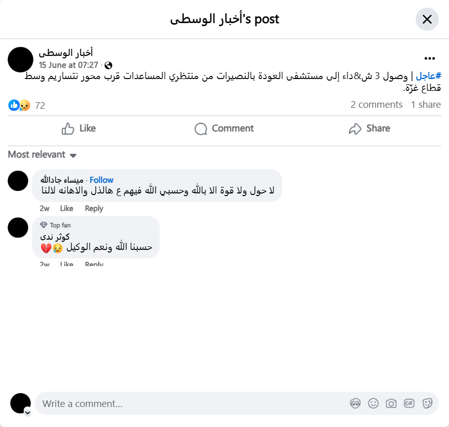 #Urgent | 3 patients have arrived at Al Awda Hospital in Nuseirat, waiting for aid near the Netzarim axis in central Gaza.
