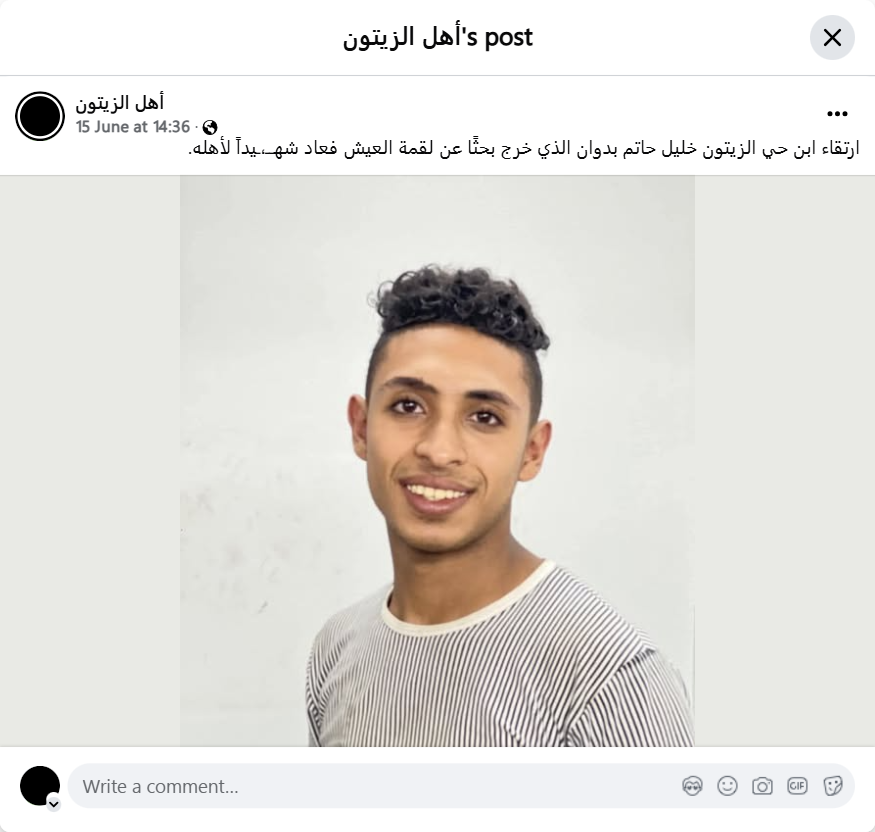 ارتقاء ابن حي الزيتون خليل حاتم بدوان الذي خرج بحثًا عن لقمة العيش فعاد شهــ،ـيداً لأهله.