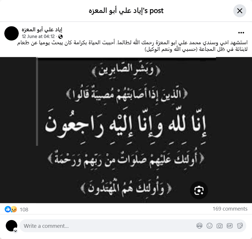 استشهد اخي وسندي محمد علي ابو المعزة رحمك الله لطالما. أحببت الحياة بكرامة كان يبحث يوميا عن طعام لابنائة في ظل المجاعة (حسبي الله ونعم الوكيل)