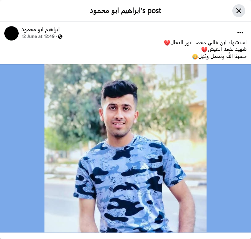The martyrdom of my cousin, Muhammad Anwar Al-Nahhal, the martyr of the livelihood. God is sufficient for us, and we act as our disposer of affairs.