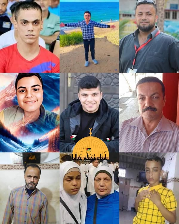 أقمَار مُخيّم جباليا من عائلة الحَاج أحمَد " أبو ريّا " والذين ارتقوا #اليوم وشطبوا من السجل المدني بالكامل 1-عطية حسين الحاج أحمد 2- وزوجته : هبة الحاج احمد3- وابنه : حمزة عطية الحاج أحمد4- سعيد حسين الحاج احمد 5-وزوجته : ختام الحاج احمد 6- وابنه : ابراهيم سعيد الحاج احمد7- وابنه : محمد سعيد الحاج احمد 8- وابنه : براء سعيد الحاج احمد 9- وابنته : آية سعيد الحاج أحمد 10- خالد حسين الحاج أحمد 11- وزوجته : امال الحاج احمد 12- وابنه : رامز خالد الحاج احمد 13- وابنه محمد خالد الحاج احمد 14- وابنته : اسيل خالد الحاج أحمد15-وابنه : حسين خالد الحاج أحمدإنّا لله وإنّا اليه راجعون