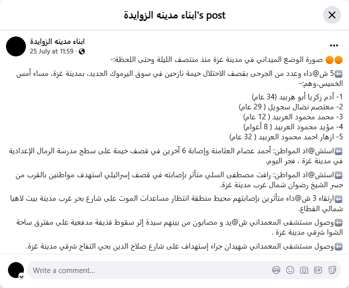 5 ش@داء وعدد من الجرحى بقصف الاحتلال خيمة نازحين في سوق اليرموك الجديد، بمدينة غزة، مساء أمس الخميس،وهم:-