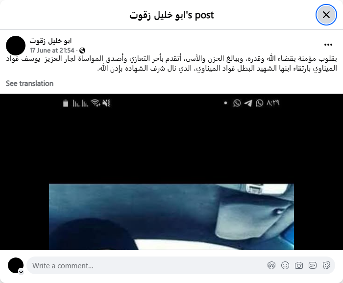 بقلوب مؤمنة بقضاء الله وقدره، وببالغ الحزن والأسى، أتقدم بأحر التعازي وأصدق المواساة لجار العزيز يوسف فواد الميناوي بارتقاء ابنها الشهيد البطل فواد الميناوي، الذي نال شرف الشهادة بإذن الله.