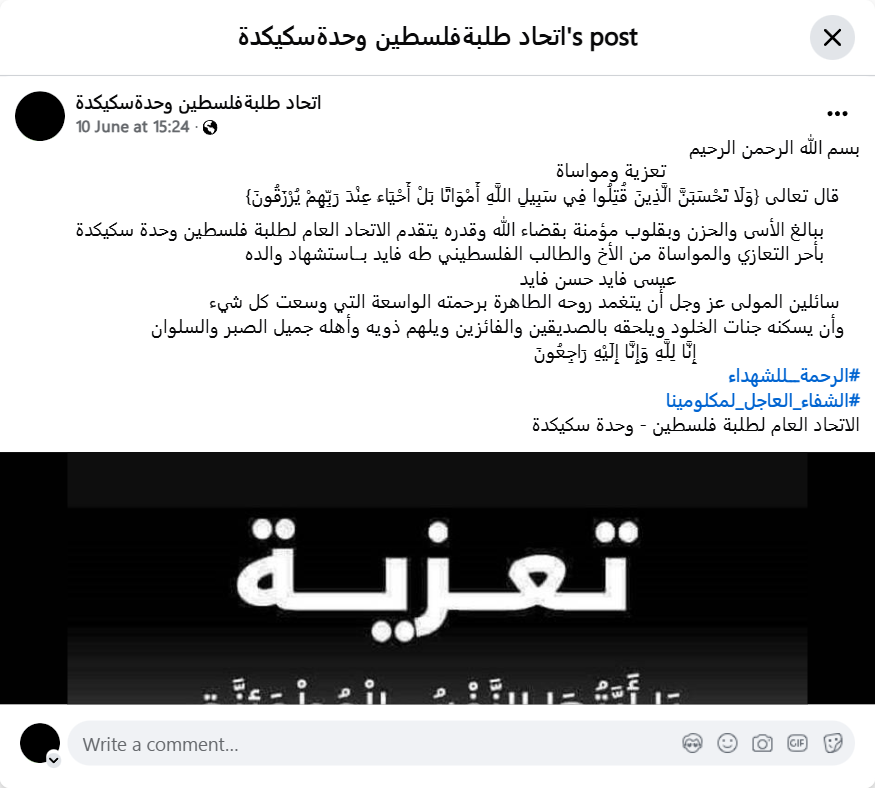 In the name of Allah, the Most Gracious, the Most Merciful Condolences and sympathy God Almighty said {And never think that those who have been killed in the cause of Allah are dead. Rather, they are alive with their Lord, and they are provided for.} With deep sorrow and sadness and with hearts that believe in God’s will and destiny, the General Union of Palestinian Students, Skikda Unit, offers its deepest condolences and sympathy to our brother and Palestinian student Taha Fayed on the martyrdom of his father Issa Fayed Hassan Fayed Asking God Almighty to have mercy on his pure soul with His vast mercy that encompasses everything and to make him dwell in the gardens of eternity and join him with the righteous and the winners and inspire his family and relatives with beautiful patience and solace. We belong to God and to Him we shall return #Mercyforthemartyrs #Speed_recovery_for_our_bereaved General Union For Palestinian students - Skikda Unit