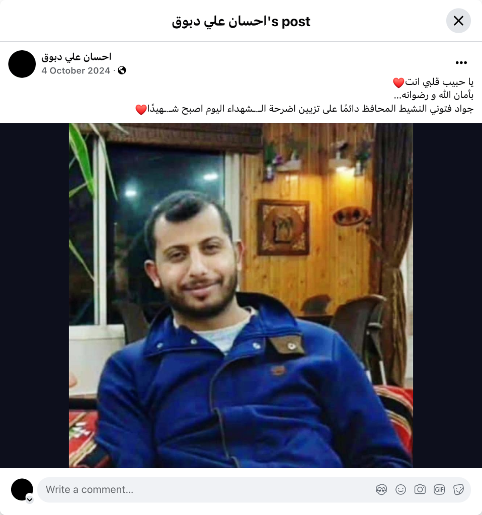 My dear, may God grant you peace and satisfaction... Jawad Fattouni, the energetic and always careful one who decorated the shrines of the martyrs, today has become a martyr.