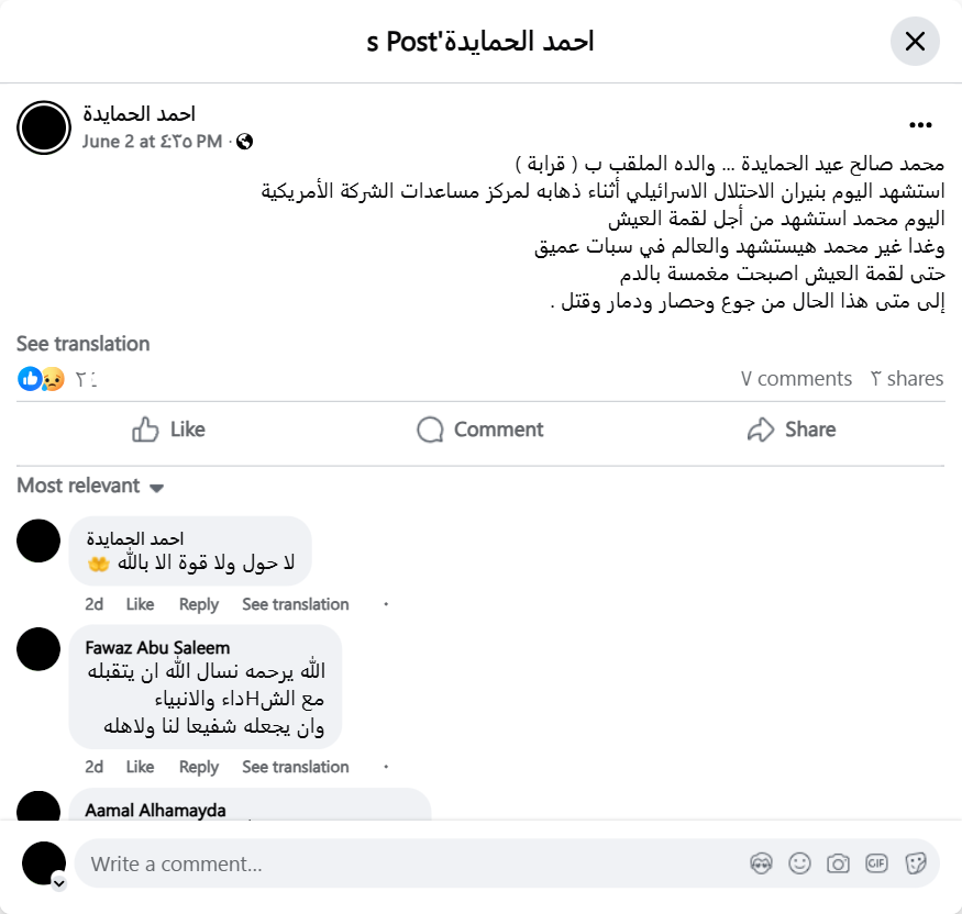 Mohammed Saleh Eid Al-Humaida... his father nicknamed (Qaraba) was martyred today by Israeli occupation fire while he was going to the American company's aid center. Today, Mohammed was martyred for the sake of a living, and tomorrow another Mohammed will be martyred, and the world is in a deep sleep, even a living has become drenched in blood. How long will this state of hunger, siege, destruction, and killing continue?