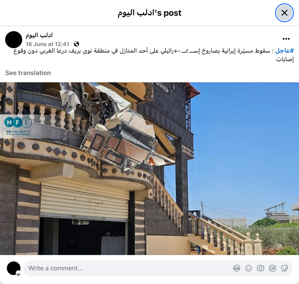 #Urgent: An Iranian drone was shot down by an Israeli missile on a house in the Nawa area in the western Daraa countryside, without any casualties.