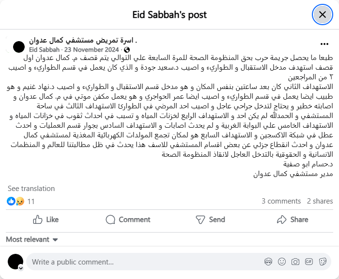 طبعا ما يحصل جريمة حرب بحق المنظومة الصحة للمرة السابعة علي التوالي يتم قصف م. كمال عدوان اول قصف استهدف مدخل الاستقبال و الطواريء و اصيب د.سعيد جودة و الذي كان يعمل في قسم الطواريء و اصيب ٢ من المراجعين الاستهداف الثاني كان بعد ساعتين بنفس المكان و هو مدخل قسم الاستقبال و الطواريء و اصيب د.نهاد غنيم و هو طبيب ايضا يعمل في قسم الطواريء و اصيب ايضا عمر الحواجري و هو يعمل مكفن موتي في م. كمال عدوان و اصابته خطير و يحتاج لتدخل جراحي عاجل و اصيب احد المرضي في الطوارئ الاستهداف الثالث في ساحة المستشفي و الحمدلله لم يكن احد و الاستهداف الرايع لخزنات المياه و تسبب في احداث ثقوب في خزانات المياه و الاستهداف الخامس علي البوابة الغربية و لم يحدث اصابات و الاستهداف السادس بجوار قسم العمليات و احدث عطل في شبكة الاكسجين و الاستهداف السابع هو لمكان تجمع المولدات الكهربائية المغذية لمستشفي كمال عدوان و احدث انقطاع جزئي عن بعض اقسام المستشفي للاسف هذا يحدث في ظل مطالبتنا للعالم و المنظمات الانسانية و الحقوقية بالتدخل العاجل لانقاذ المنظومة الصحةد.حسام ابو صفية مدير مستشفي كمال عدوان
