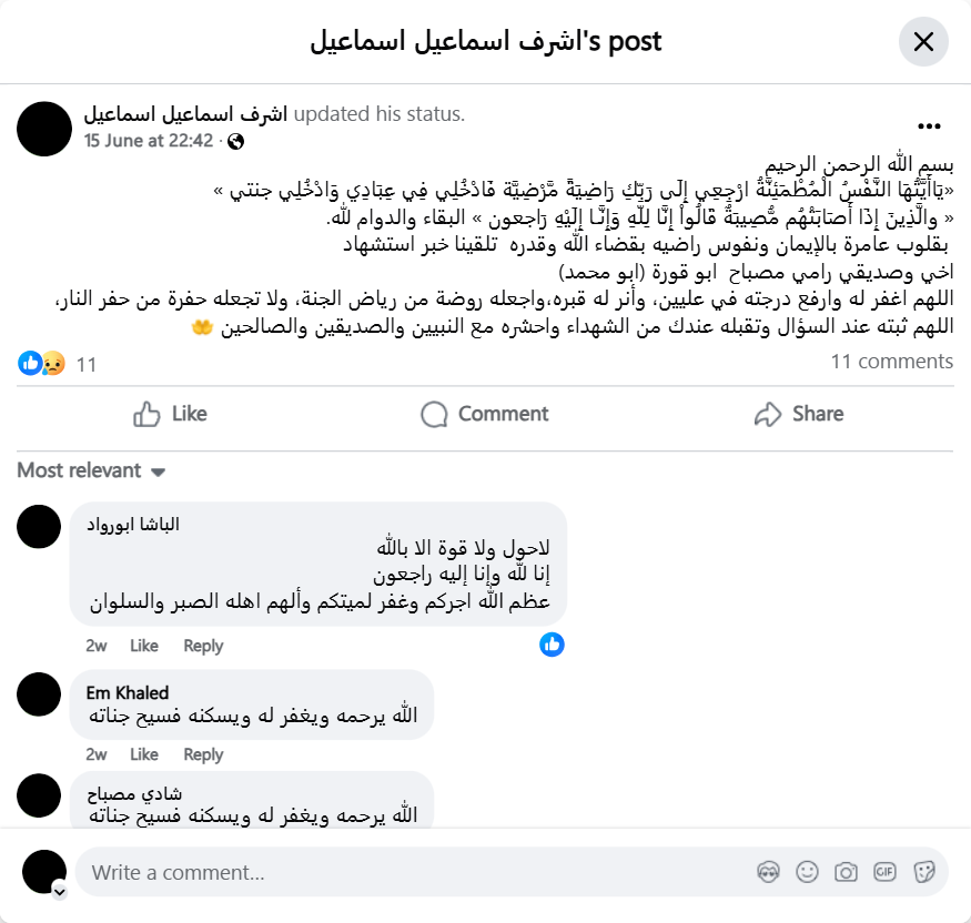 In the name of God, the Most Gracious, the Most Merciful. “O reassured soul, return to your Lord, well-pleased and pleasing [to Him], and enter among My [righteous] servants and enter My Paradise.” “And those who, when disaster strikes them, say, ‘Indeed we belong to God, and indeed to Him we will return.’” To God belong all eternity and permanence. With hearts full of faith and souls satisfied with God’s will and destiny, we received the news of the martyrdom of my brother and friend Rami Misbah Abu Qura (Abu Muhammad). O God, forgive him and raise his rank in the highest heavens, and illuminate his grave, and make it a garden from the gardens of Paradise, and do not make it a pit from the pits of Hellfire. O God, make him steadfast when questioned and accept him among the martyrs and gather him with the prophets, the truthful, and the righteous.