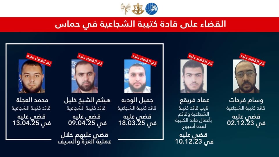 #عاجل للمرة الخامسة منذ بداية الحرب: جيش الدفاع والشاباك قضيا على قائد كتيبة الشجاعية التابعة لمنظمة حماس الإرهابية، بعد أن تمت تصفية سلفه الأسبوع الماضي