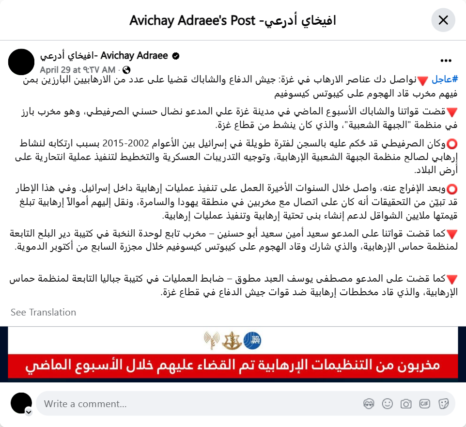 URL: https://www.facebook.com/IDFarabicAvichayAdraee/posts/pfbid0juN7XxD9bCQwAUvVZMaE6umTx4aVzW8G5p4WEofreQBUwa51yNdjyGJyQ6Y6tDFal