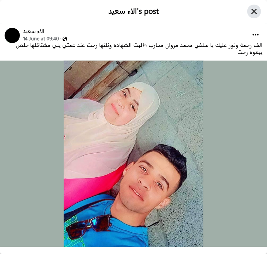 A thousand mercies and light upon you, my Salafi Muhammad Marwan Muharab. I asked for martyrdom and I got it. I went to my aunt, whom I miss. They finally sold him. I went.