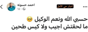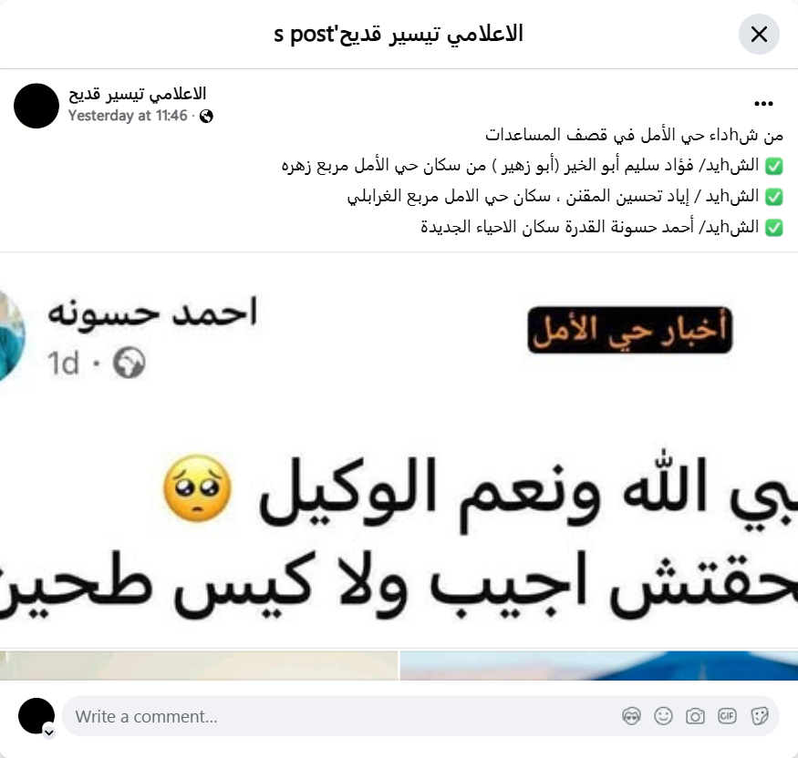 From the martyrs of Al-Amal neighborhood in the bombing of aid, the martyr/Fouad Salim Abu Al-Khair (Abu Zuhair), a resident of Al-Amal neighborhood, Zahra Square, the martyr/Iyad Tahseen Al-Muqanin, a resident of Al-Amal neighborhood, Al-Gharabli Square, the martyr/Ahmed Hassouna Al-Qudra, a resident of the new neighborhoods