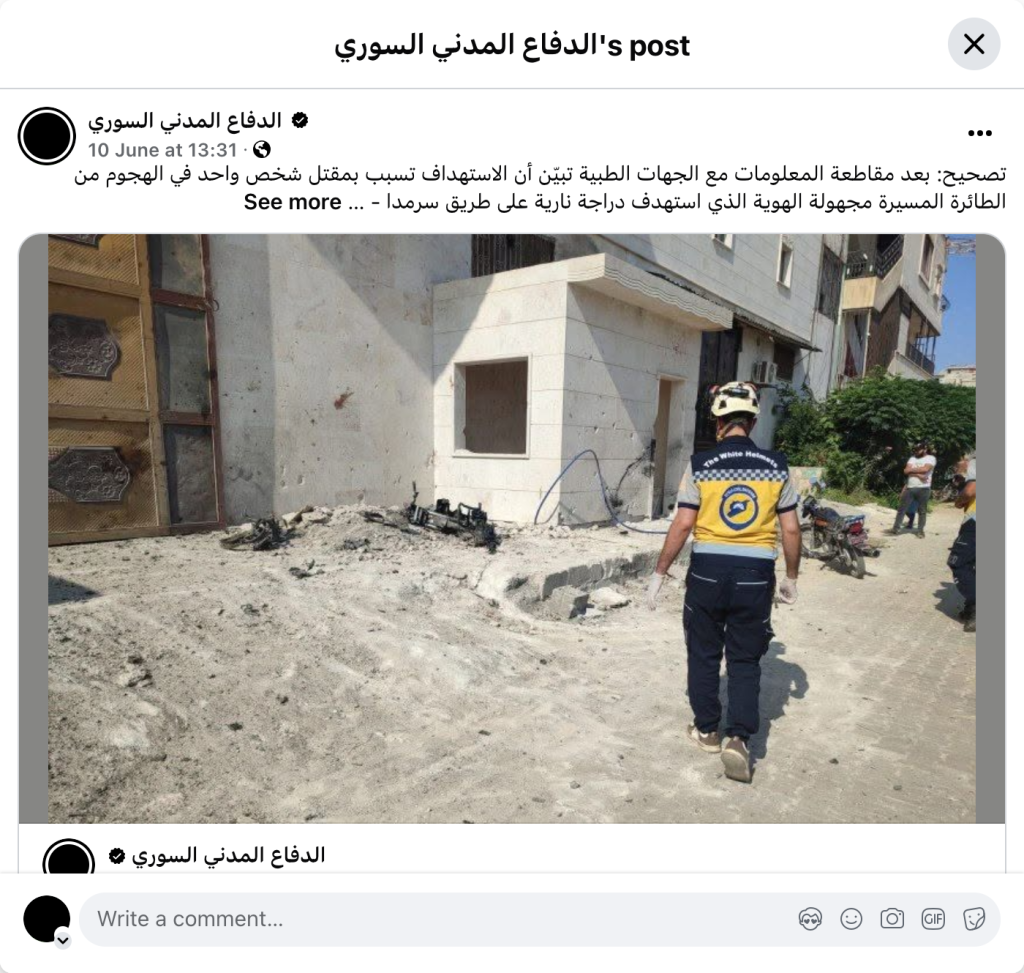 تصحيح: بعد مقاطعة المعلومات مع الجهات الطبية تبيّن أن الاستهداف تسبب بمقتل شخص واحد في الهجوم من الطائرة المسيرة مجهولة الهوية الذي استهدف دراجة نارية على طريق سرمدا - … See more مقتل شخصين مجهولي الهوية، بهجوم صاروخي من طائرة مسيّرة مجهولة الهوية، استهدف دراجة نارية يستقلانها على طريق سرمدا - البردقلي شمالي #إدلب، صباح اليوم الثلاثاء 10 حزيران،… See more