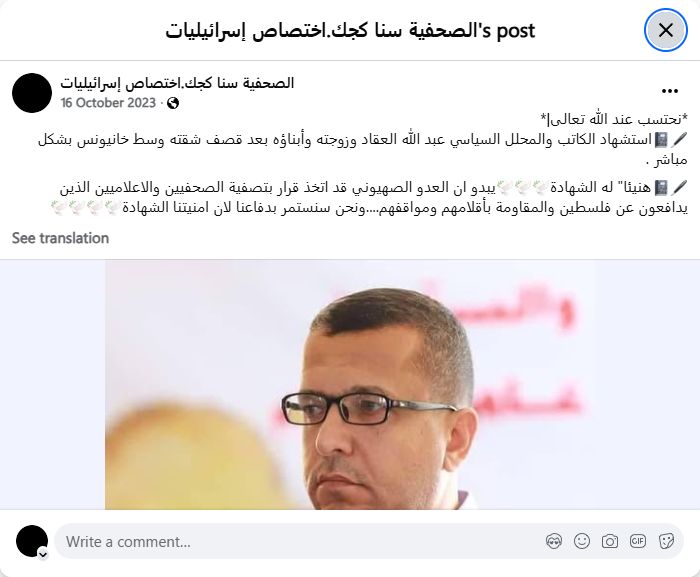 It appears that the Zionist enemy has made a decision to liquidate journalists and media professionals who defend Palestine and the resistance with their pens and positions...and we will continue our defense because our wish is martyrdom.