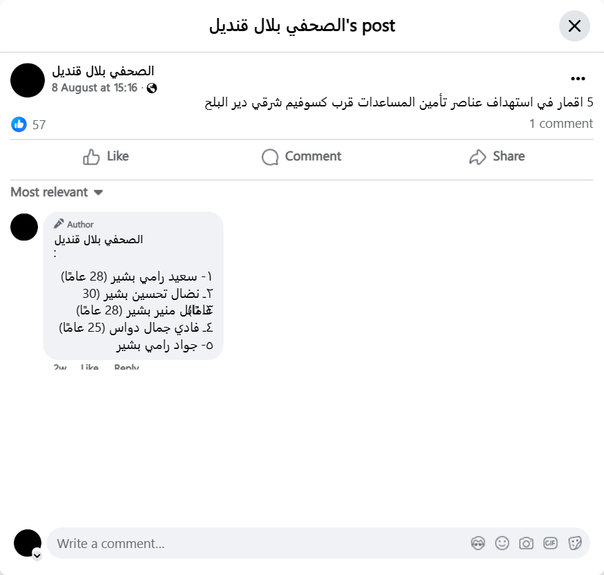 5 satellites targeting aid convoy personnel near Kassufim, east of Deir al-Balah.