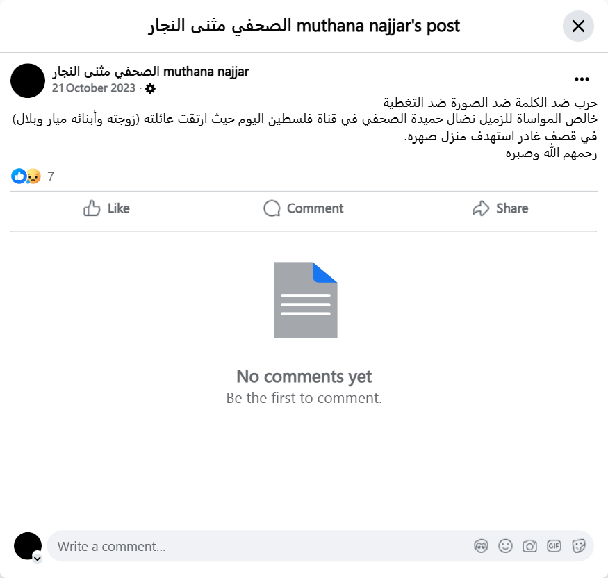 A war against words, against images, against coverage. Our sincere condolences go out to our colleague Nidal Hamida, a journalist with Palestine Today TV, whose family (his wife and children, Mayar and Bilal) were killed in a treacherous bombing that targeted his son-in-law's home. May God have mercy on them and grant them patience.