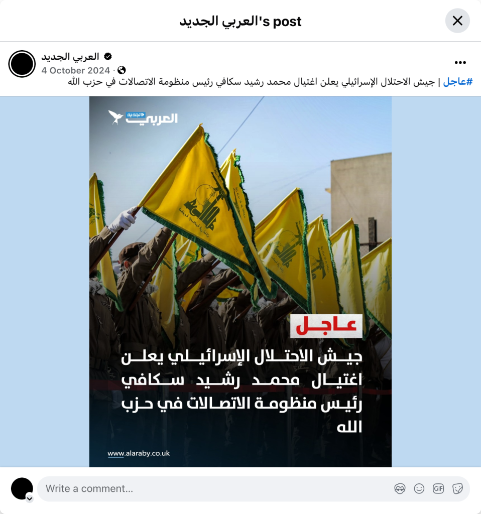 #عاجل | جيش الاحتلال الإسرائيلي يعلن اغتيال محمد رشيد سكافي رئيس منظومة الاتصالات في حزب الله
