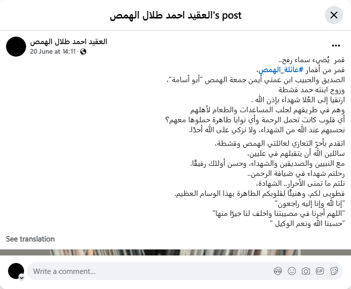 A moon from the moons of the #Al-Hams family, my friend and beloved cousin Ayman Jumaa Al-Hams "Abu Osama", and his daughter's husband Hamad Qishta, ascended to the highest heavens as martyrs, God willing. They were on their way to bring aid and food to their families.