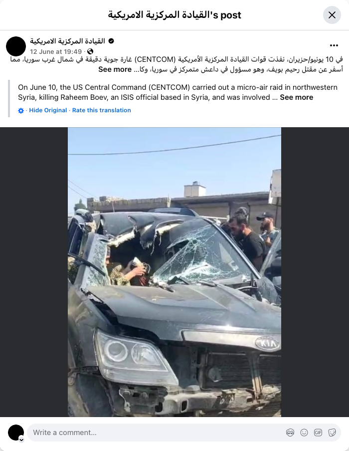 On June 10, the US Central Command (CENTCOM) carried out a micro-air raid in northwestern Syria, killing Raheem Boev, an ISIS official based in Syria, and was involved … See more · Hide Original · Rate this translation