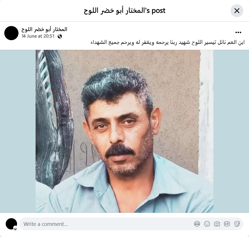 My cousin Nael Tayseer Al-Louh is a martyr. May God have mercy on him and forgive him and have mercy on all the martyrs.