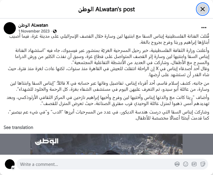 The Palestinian Ministry of Culture announced the death of the Gazan playwright in a Facebook post, which read, "The martyrdom of artist Enas Al-Sakka and her two daughters, Lynn and Sarah, as a result of the ongoing bombing of the Gaza Strip. She had previously conducted numerous drama and theater workshops with children and participated in numerous interactive community activities."