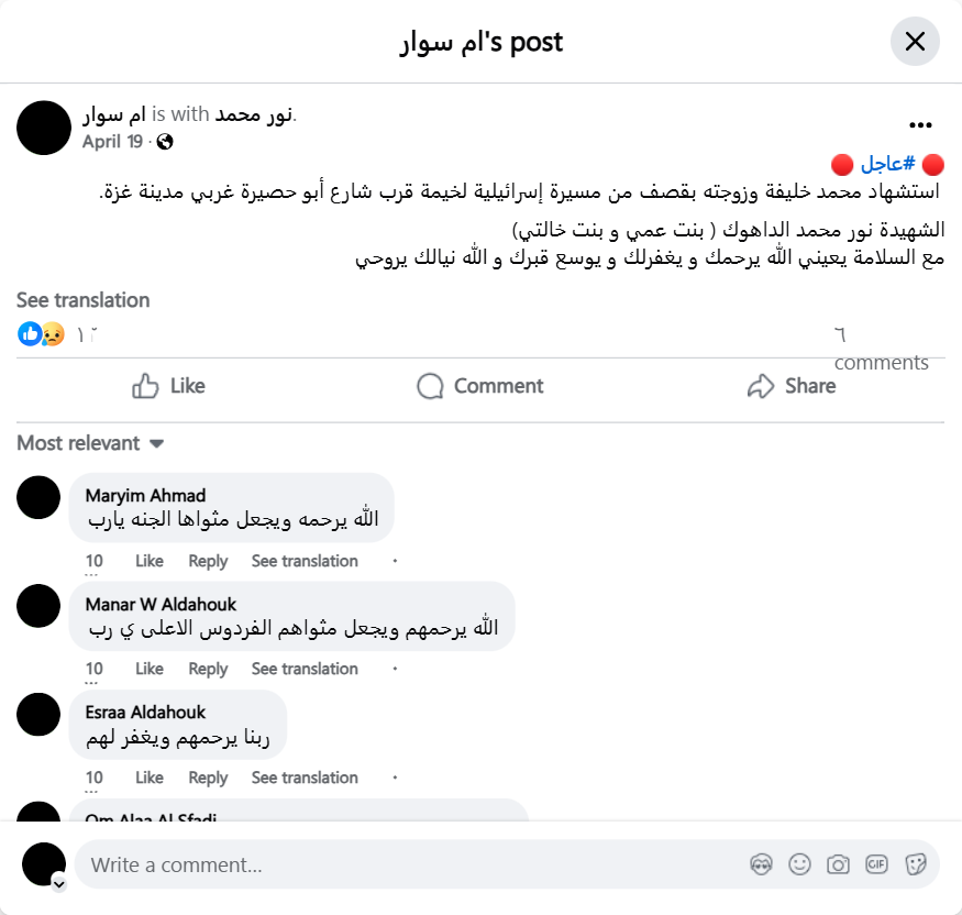 #Urgent: Mohammed Khalifa and his wife were martyred in an Israeli drone strike on a tent near Abu Hasira Street, west of Gaza City. The martyr Nour Mohammed Al-Dahouk (my cousin and my aunt's daughter)