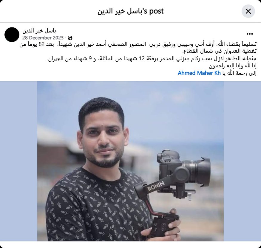 In submission to God's will, I announce the martyrdom of my brother, my beloved, and my companion, photojournalist Ahmed Khair El-Din, after 82 days of covering the aggression in the northern Gaza Strip.