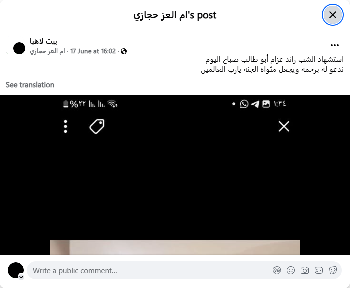 The martyrdom of the young man, Raed Azzam Abu Talib, this morning. We pray to God to have mercy on him and to make his abode in heaven, O Lord of the worlds.