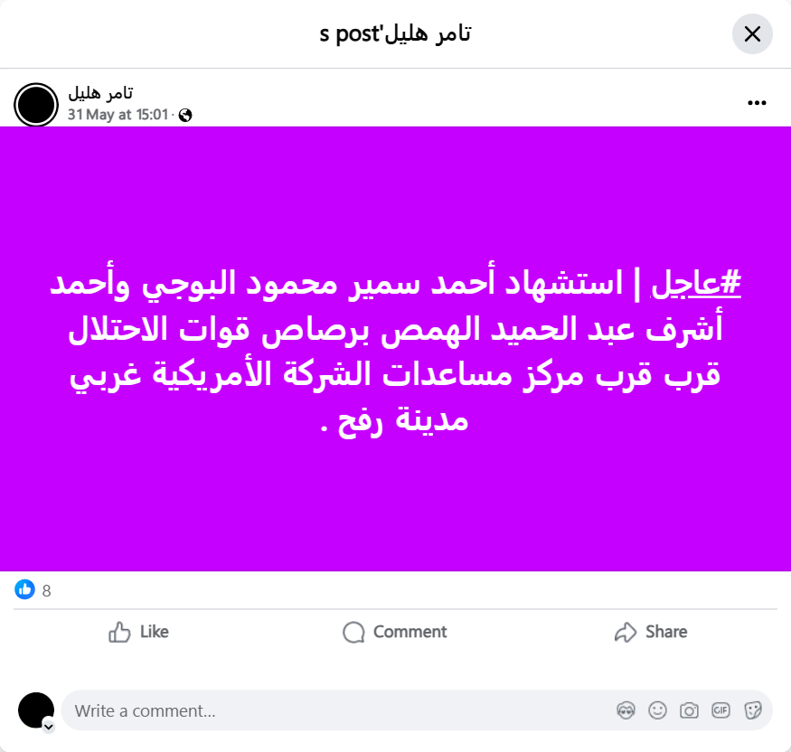 #عاجل | استشهاد أحمد سمير محمود البوجي وأحمد أشرف عبد الحميد الهمص برصاص قوات الاحتلال قرب قرب مركز مساعدات الشركة الأمريكية غربي مدينة رفح .#عاجل | استشهاد أحمد سمير محمود البوجي وأحمد أشرف عبد الحميد الهمص برصاص قوات الاحتلال قرب قرب مركز مساعدات الشركة الأمريكية غربي مدينة رفح .