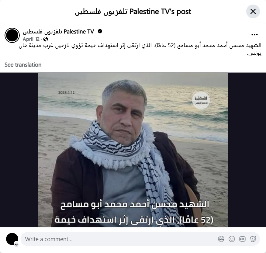 Archive URL: https://airwars.org/source/www-facebook-com-%d8%aa%d9%84%d9%81%d8%b2%d9%8a%d9%88%d9%86-%d9%81%d9%84%d8%b3%d8%b7%d9%8a%d9%86-palestine-tv-pfbid0gbgwra1jxwhx3umpyaw9ybc8dqn9z5yb9gsjn1jcdtemhnsy1csfma8tupepv7mul-2025-04-12-0/