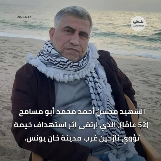 الشهيد محسن أحمد محمد أبو مسامح (52 عامًا)، الذي ارتقى إثر استهداف خيمة تؤوي نازحين غرب مدينة خان يونس.