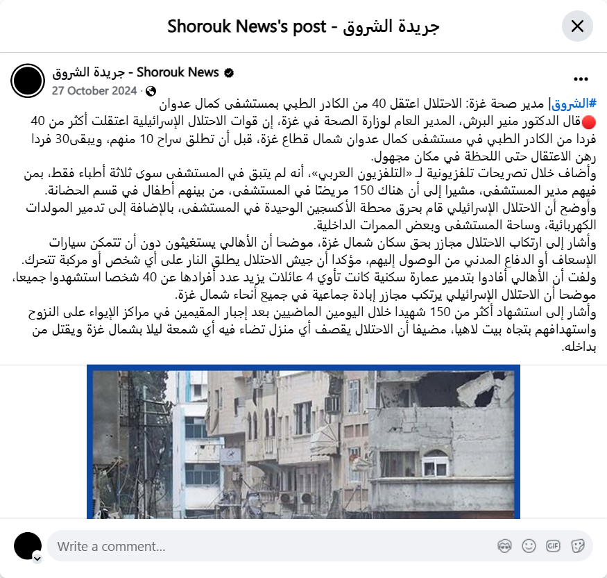 Archive URL: https://airwars.org/source/www-facebook-com-%d8%ac%d8%b1%d9%8a%d8%af%d8%a9-%d8%a7%d9%84%d8%b4%d8%b1%d9%88%d9%82-shorouk-news-pfbid02pz1ncu9lfvl1shmvwkuysdtwvgz6pskfxjigdmbrwcjptrmhu1vkscacxjnrdn8fl-2024-10-27-110000/