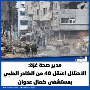 #Shorouk Gaza Health Director: Occupation Forces Arrest 40 Medical Staff at Kamal Adwan Hospital Dr. Munir al-Barsh, Director General of the Ministry of Health in Gaza, said that the Israeli occupation forces arrested more than 40 medical staff at Kamal Adwan Hospital in the northern Gaza Strip, before releasing 10 of them, while 30 remain in detention at an unknown location. He added, during televised statements to Al-Arabiya TV, that only three doctors remain in the hospital, including the hospital director, noting that there are 150 patients in the hospital, including children in the nursery. He explained that the Israeli occupation forces burned the only oxygen station in the hospital, in addition to destroying the electric generators, the hospital courtyard, and some internal corridors. He pointed out that the occupation forces are committing massacres against the residents of northern Gaza, explaining that the residents are calling for help without ambulances or civil defense being able to reach them, stressing that the occupation army is shooting at any moving person or vehicle. He pointed out that the residents reported the destruction of a residential building that housed four families with more than 40 members. They were all martyred, he explained, noting that the Israeli occupation is committing genocidal massacres throughout northern Gaza. He pointed out that more than 150 martyrs have been killed in the past two days after residents of shelters were forced to flee and targeted towards Beit Lahia. He added that the occupation bombs any house in which a candle is lit at night in northern Gaza, killing those inside.