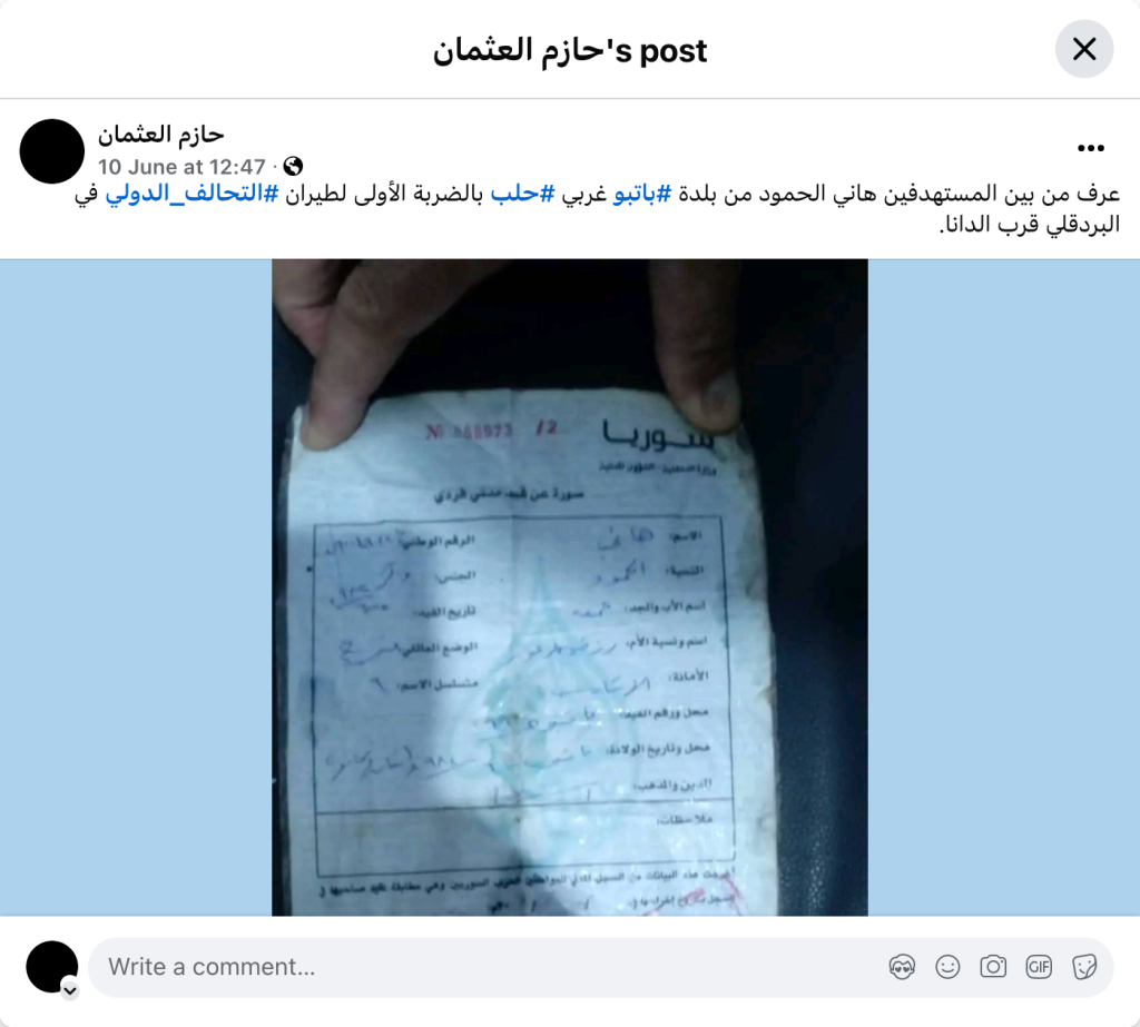Among those targeted was Hani Al-Hamoud, from the town of #Batbo, west of #Aleppo, in the first strike by the #International_Coalition aircraft in Al-Bardaqli, near Al-Dana.