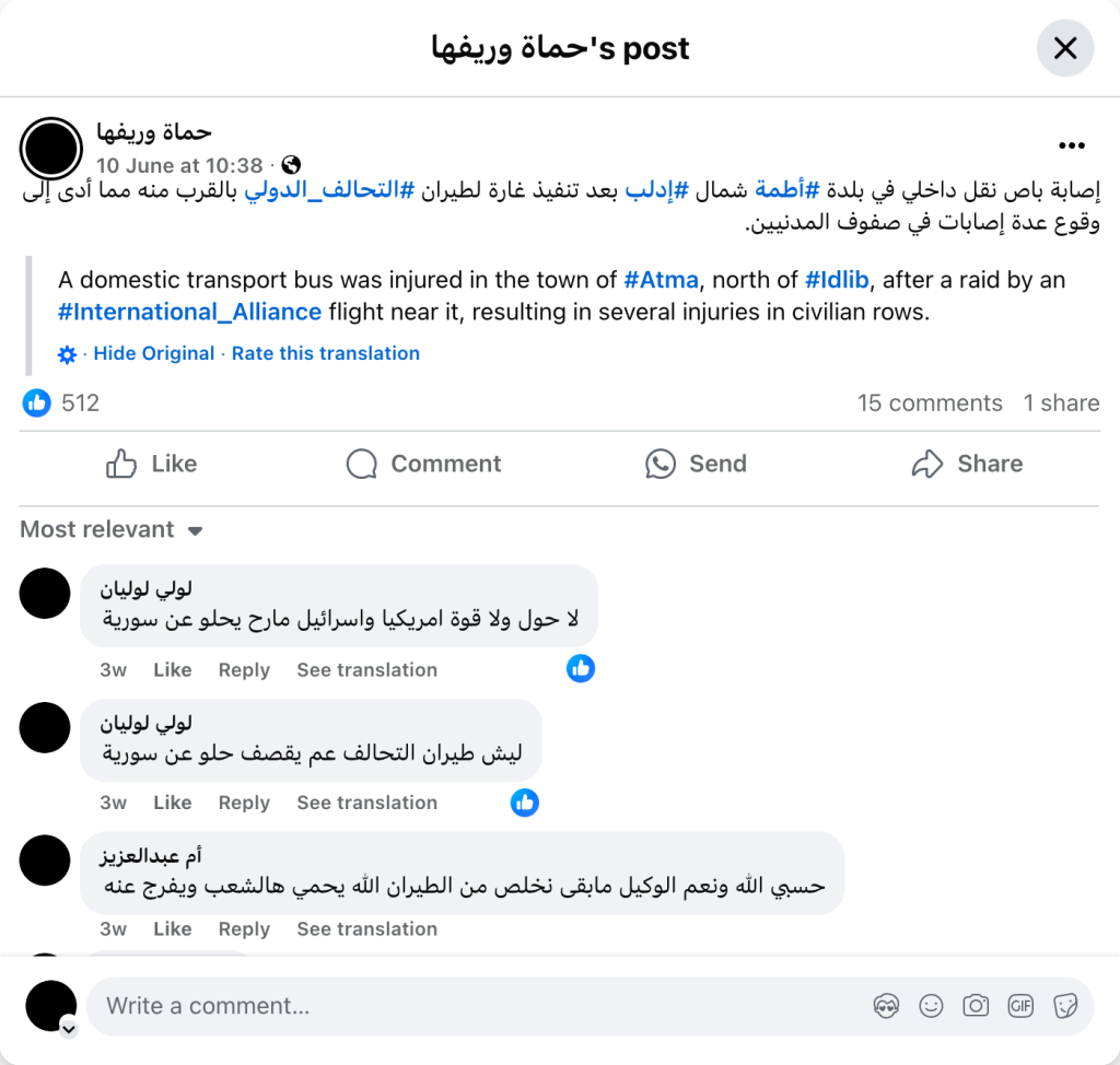 A domestic transport bus was injured in the town of #Atma, north of #Idlib, after a raid by an #International_Alliance flight near it, resulting in several injuries in civilian rows. · Hide Original · Rate this translation
