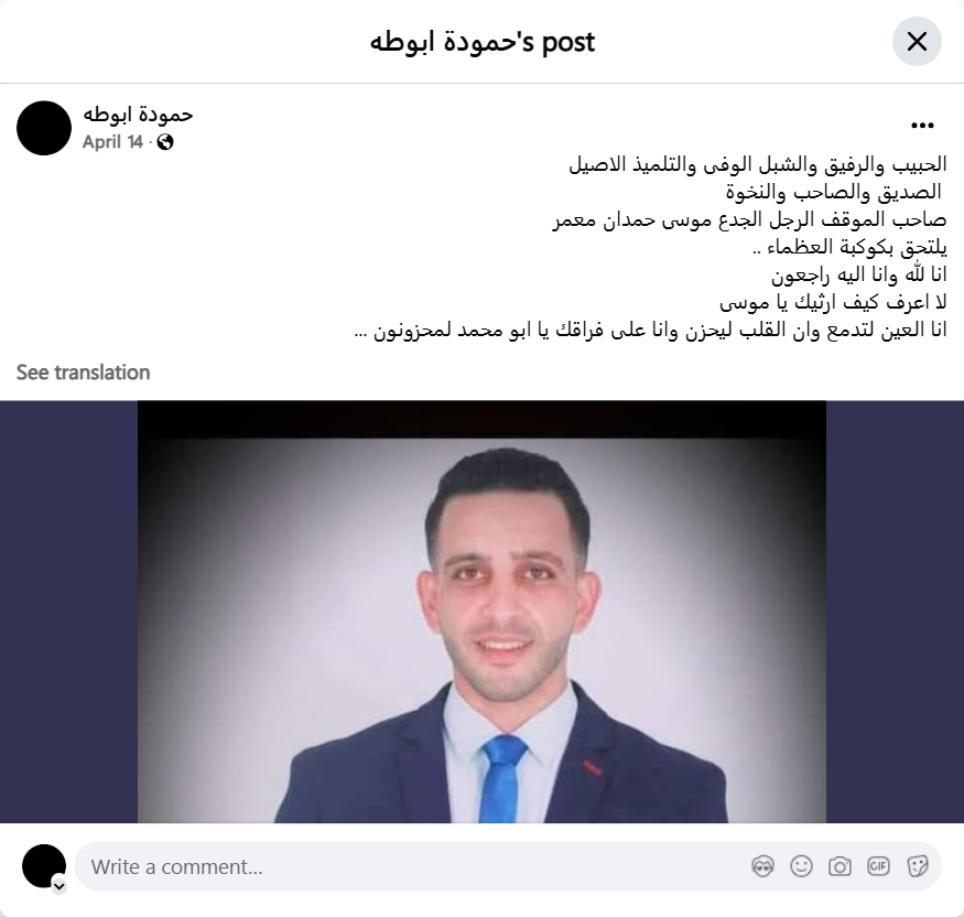 The beloved, the companion, the loyal lion, the genuine student, the friend, the companion, the chivalry, the man of standing, the generous man, Musa Hamdan Muammar joins the constellation of greats... We belong to God and to Him we shall return. I do not know how to mourn you, Musa. My eyes shed tears, my heart is sad, and we are truly grieved by your departure, Abu Muhammad...