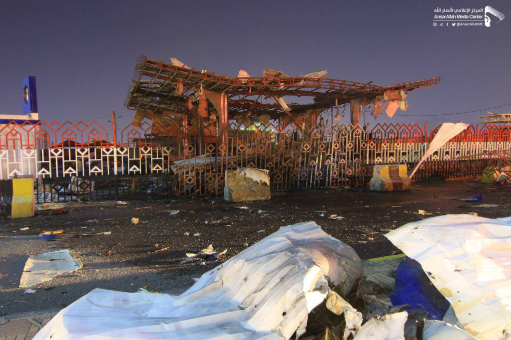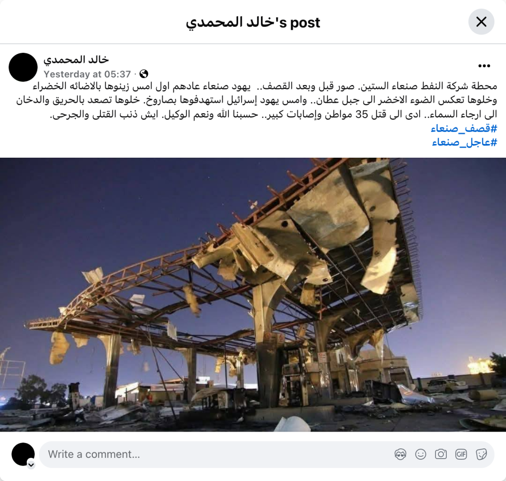 Sana'a Oil Company's 60th Station. Before and after photos.. The Jews of Sana'a decorated it with green lights the day before yesterday and made it reflect the green light to Mount Attan.. And yesterday the Jews of Israel targeted it with a missile. They let it rise with fire and smoke to the sky.. Leading to the killing of 35 citizens and many injuries.. God is sufficient for us, and He is the best Disposer of affairs. What is the fault of the dead and wounded?