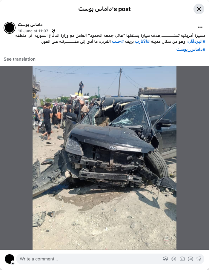 An American drone targeted a car carrying Hani Jumaa Al-Hamoud, an employee with the Syrian Ministry of Defense, in the #Bardaqili area. He is a resident of the city of #Atarib in the western #Aleppo countryside, which led to his immediate death. #Damas_Post