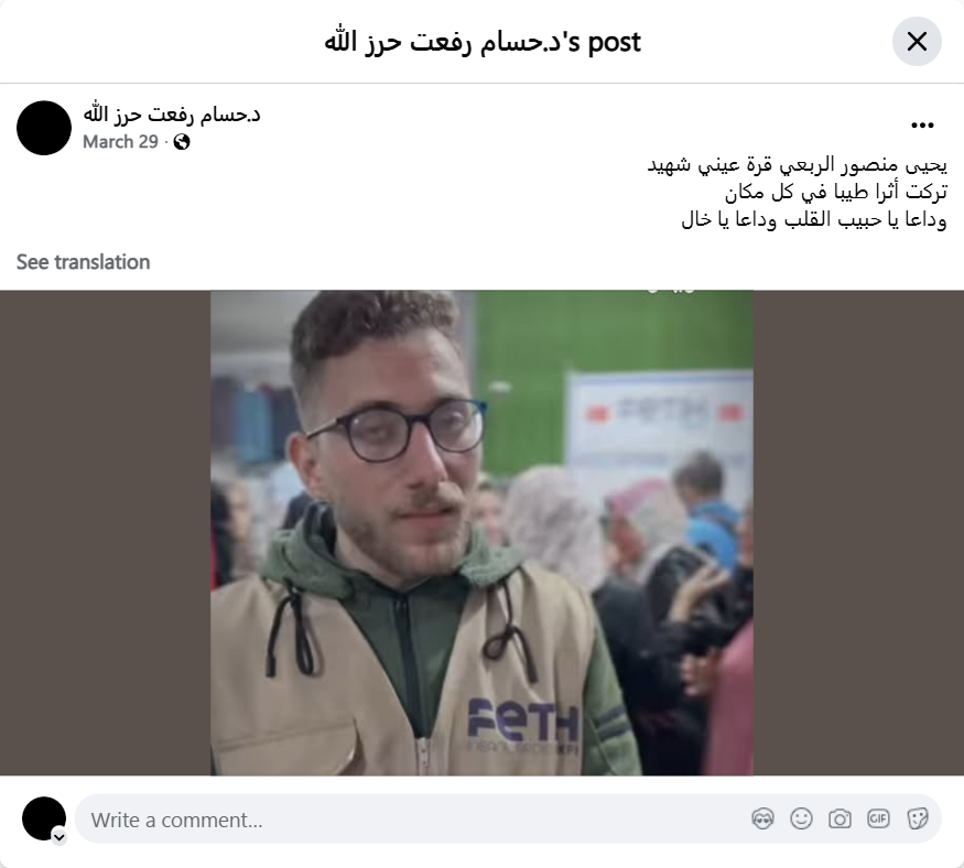 Yahya Mansour Al-Rabie, the apple of my eye, a martyr. You left a positive impact everywhere. Farewell, my beloved. Farewell, my uncle.