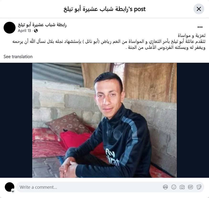 تتقدم عائلة أبو تيلخ بأحر التعازي و المواساة من العم رياض (أبو نائل ) بإستشهاد نجله بلال نسأل الله أن يرحمه ويغفر له ويسكنه الفردوس الأعلى من الجنة .